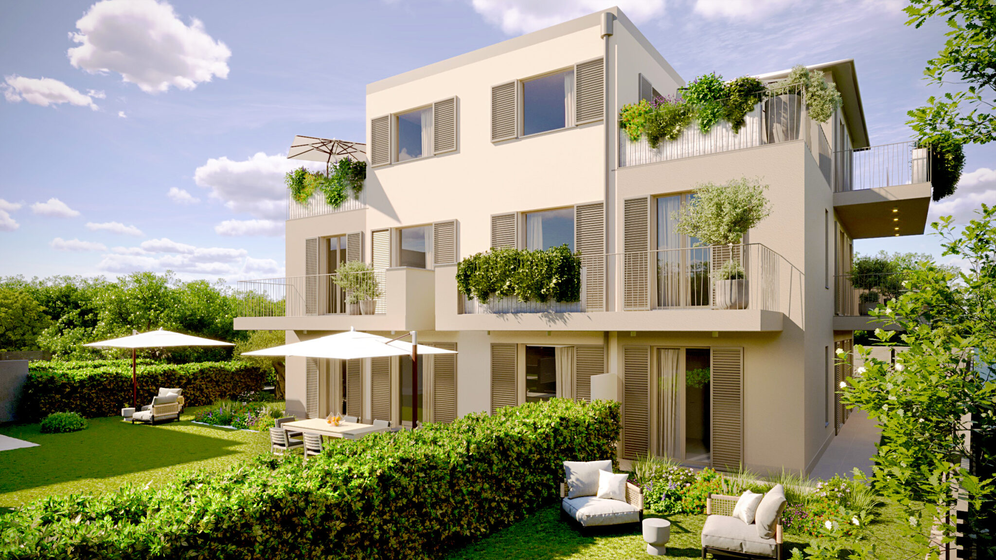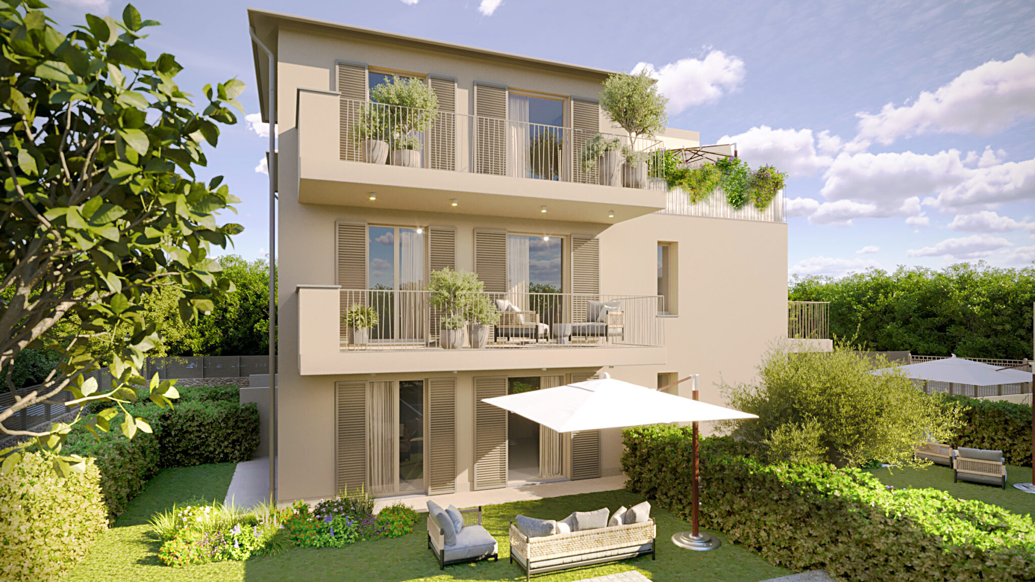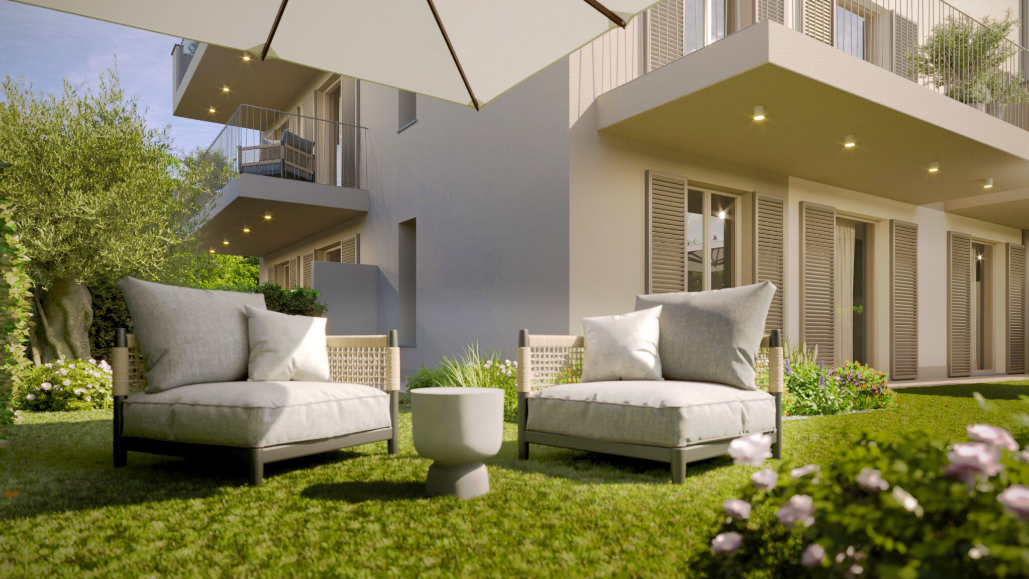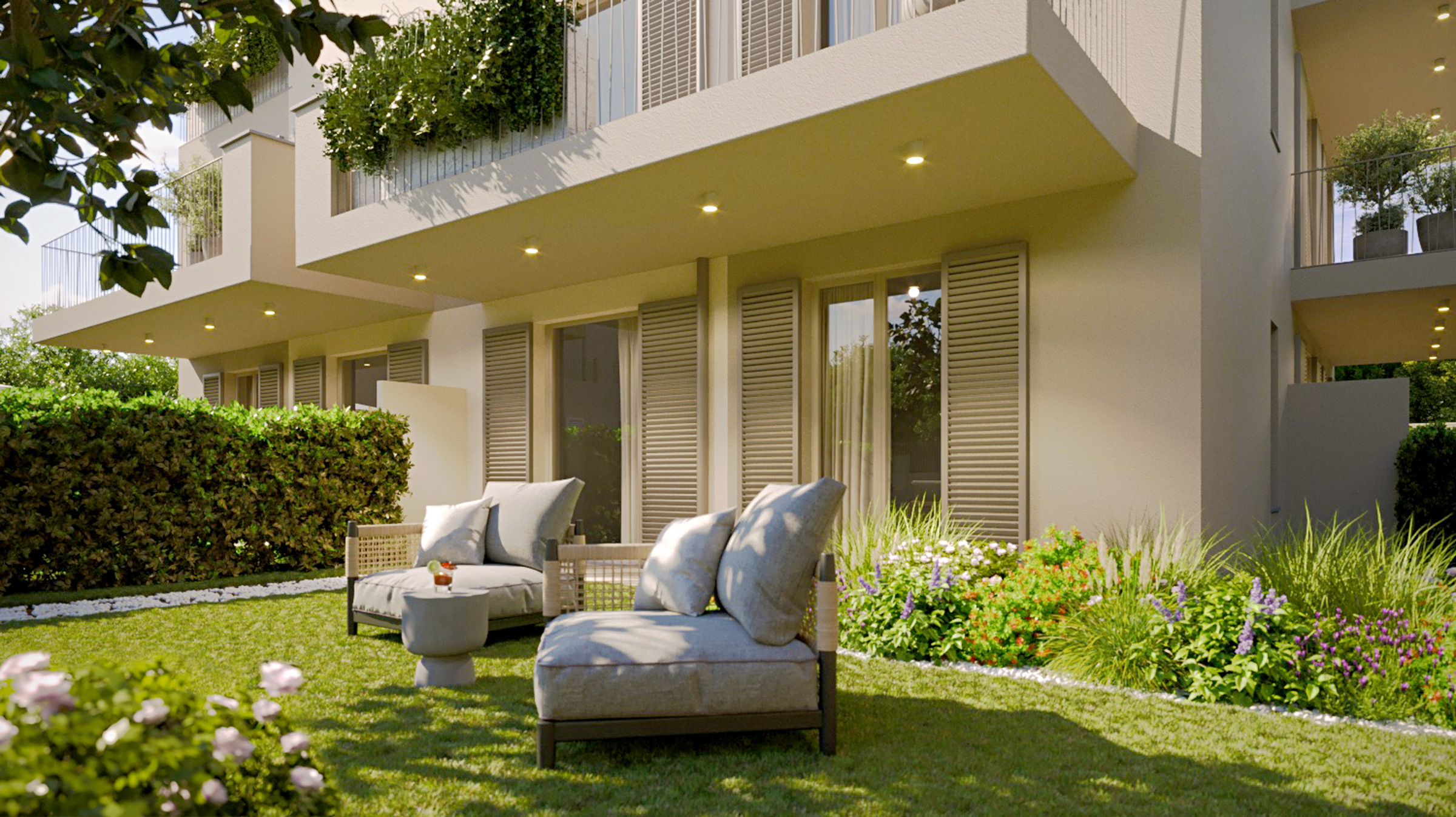 Gli appartamenti sono vere oasi di tranquillità: bilocali e trilocali con giardini privati o terrazzi spaziosi, ideali per rilassarsi e pranzare all’aperto con vista mare o verdi colline. La raffinata architettura moderna impiega materiali di pregio locali, con finiture eleganti e design contemporaneo.
